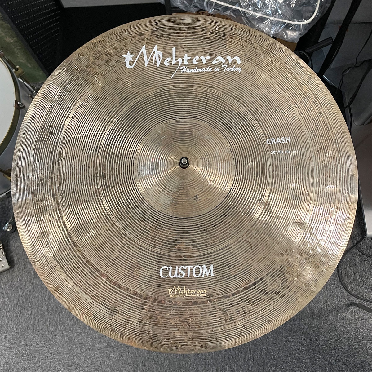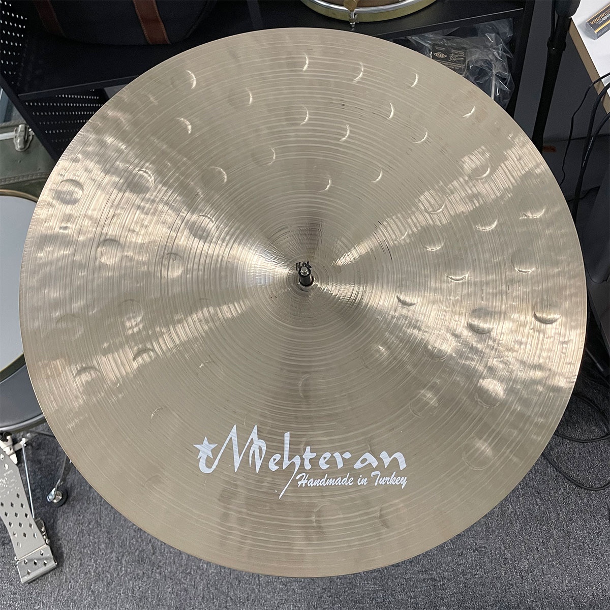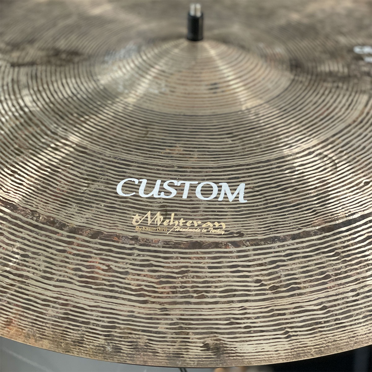 Custom bestillt cymbal. Ekstrahamret. Dreid underside. Pinstripe dreiing på toppen. 1606 gram.