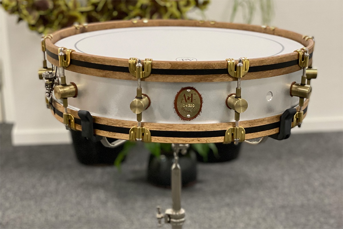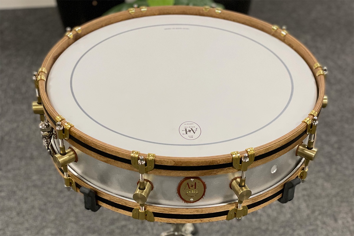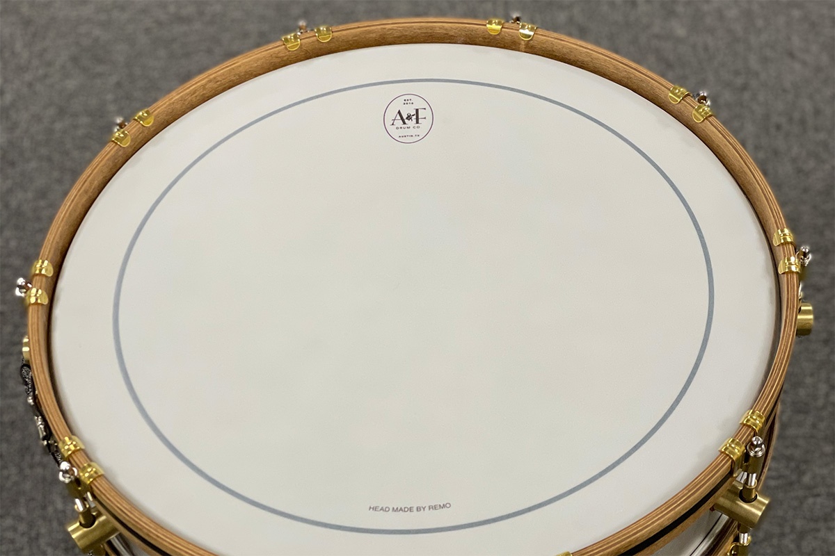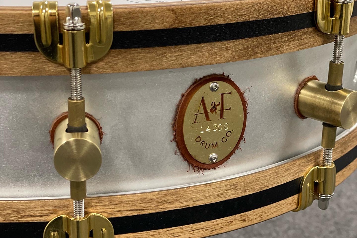 A&F kutter, ruller, sveiser og pusser alle metalltrommene selv. De får rå messing hoops, lugs og hardware. Remo Ambassador skinn og rå aluminiumsfinish.